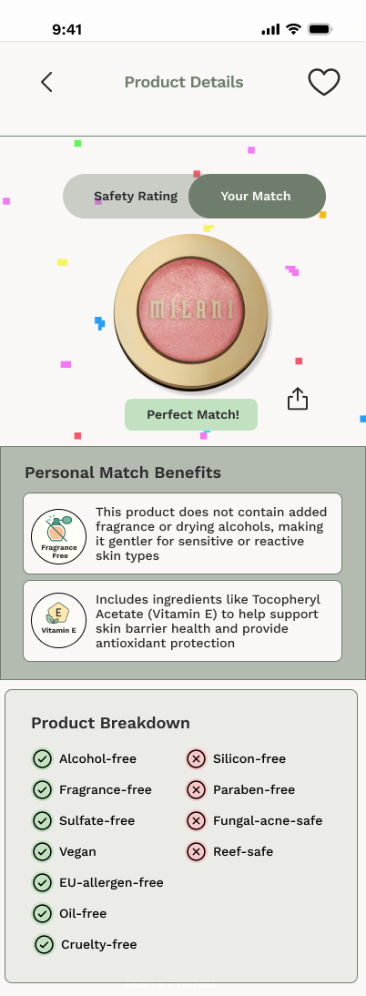 Everyone understood the safety score visually. However, some users wanted clarity on how it was calculated or what made an ingredient “good.”Ingredient + Match Info: