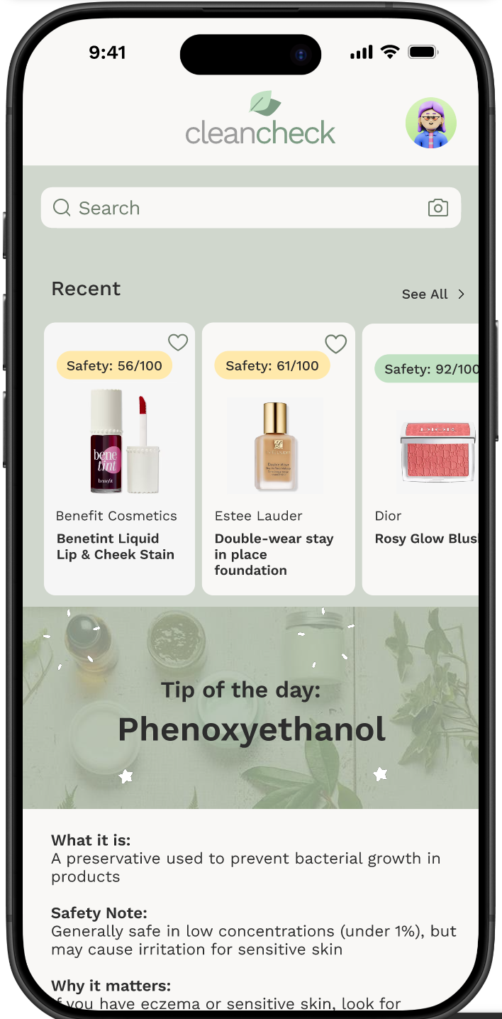 Empowering Conscious Consumers – CleanCheck aims to simplify the research process for beauty shoppers by delivering user-friendly safety scores, ingredient tips, and daily education, all in one place