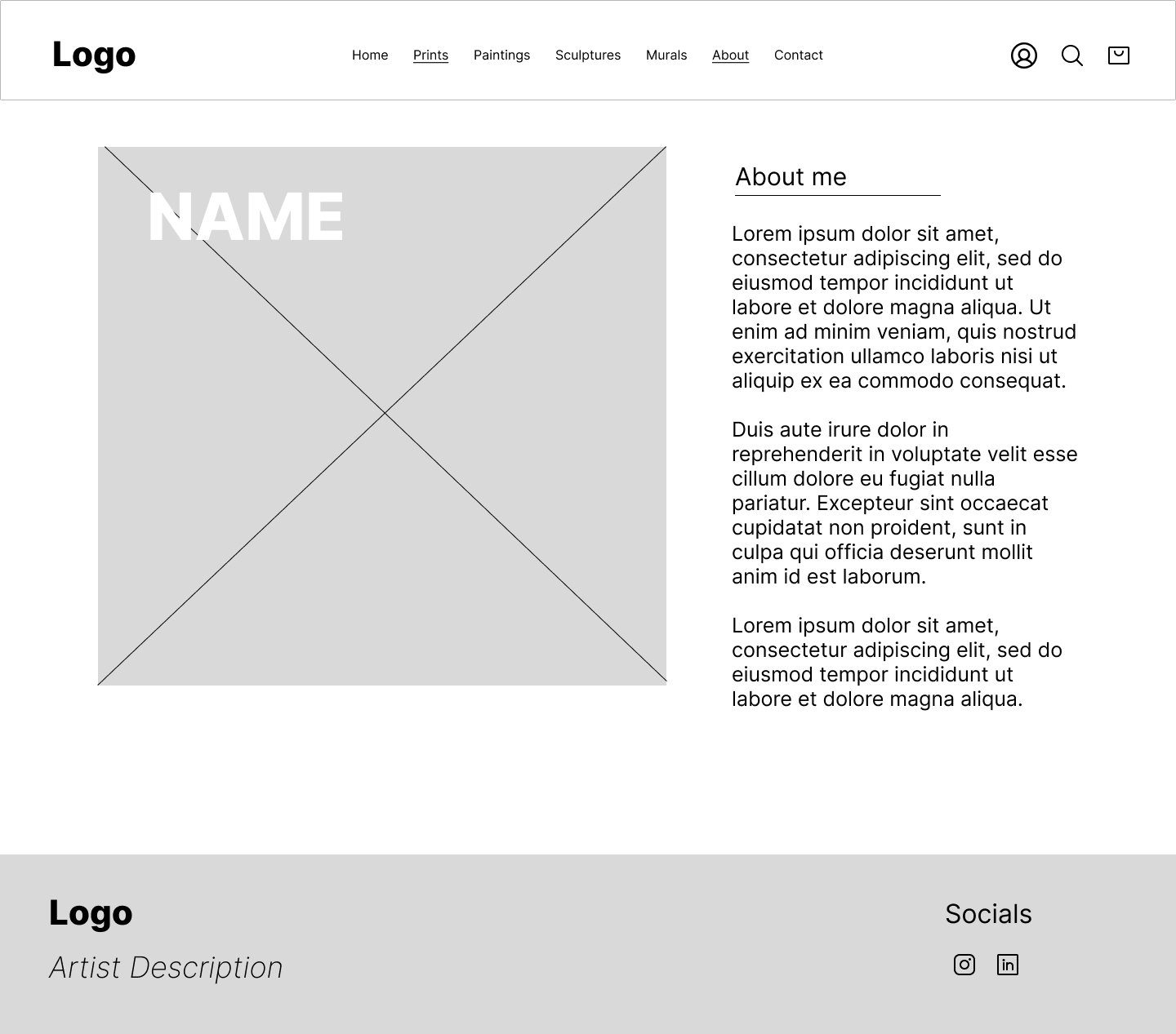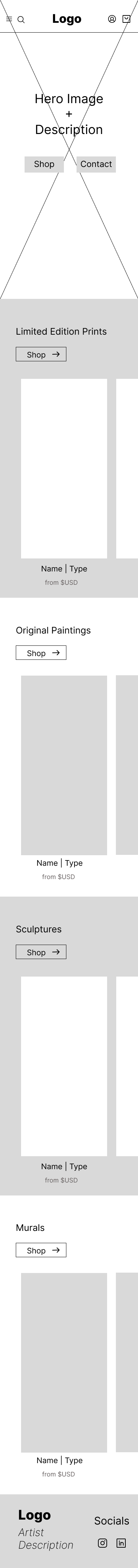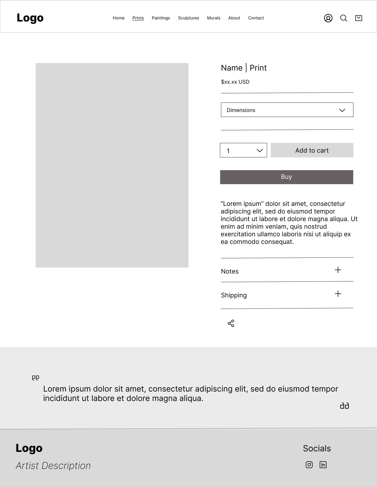 Wireframing: Built low-fidelity wireframes to explore how artists could showcase their work, sell pieces, and manage commissions through a clean and intuitive layout. These wireframes prioritized clarity, pricing transparency, and ease of navigation for both artists and buyers.