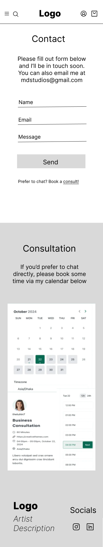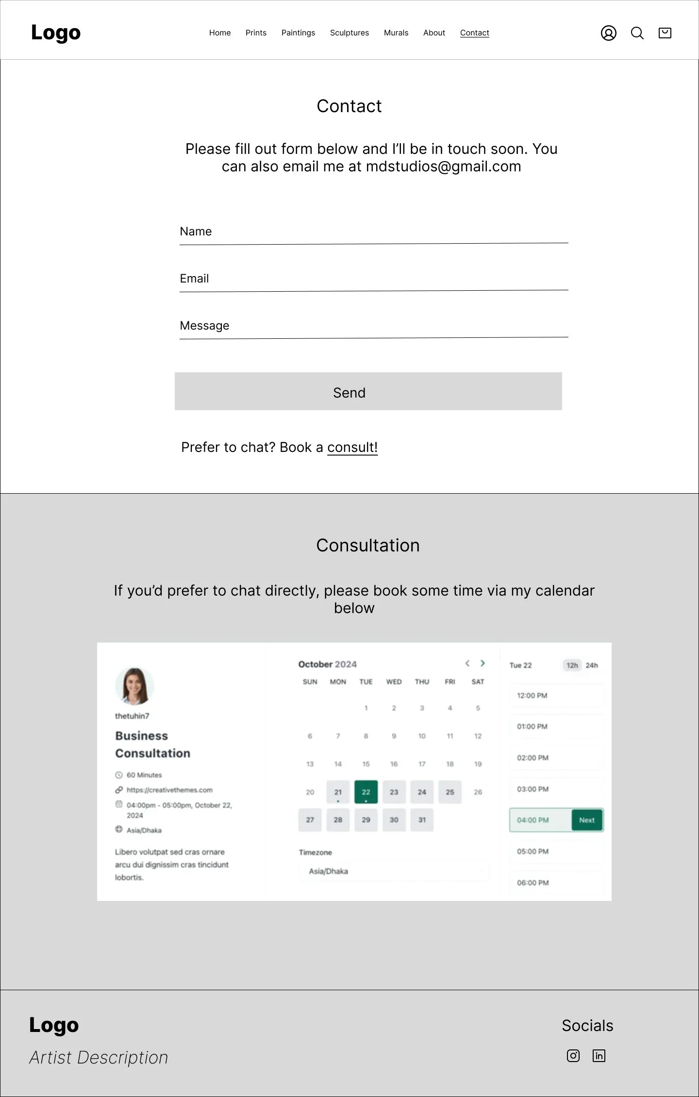 User testing confirmed the site’s strong visual appeal and intuitive navigation, especially for visually driven users. Feedback revealed key areas for improvement, most notably around trust-building elements, clarity in booking interactions, and enhancing content scannability. These refinements helped create a more seamless and credible experience for both art buyers and commission clients.