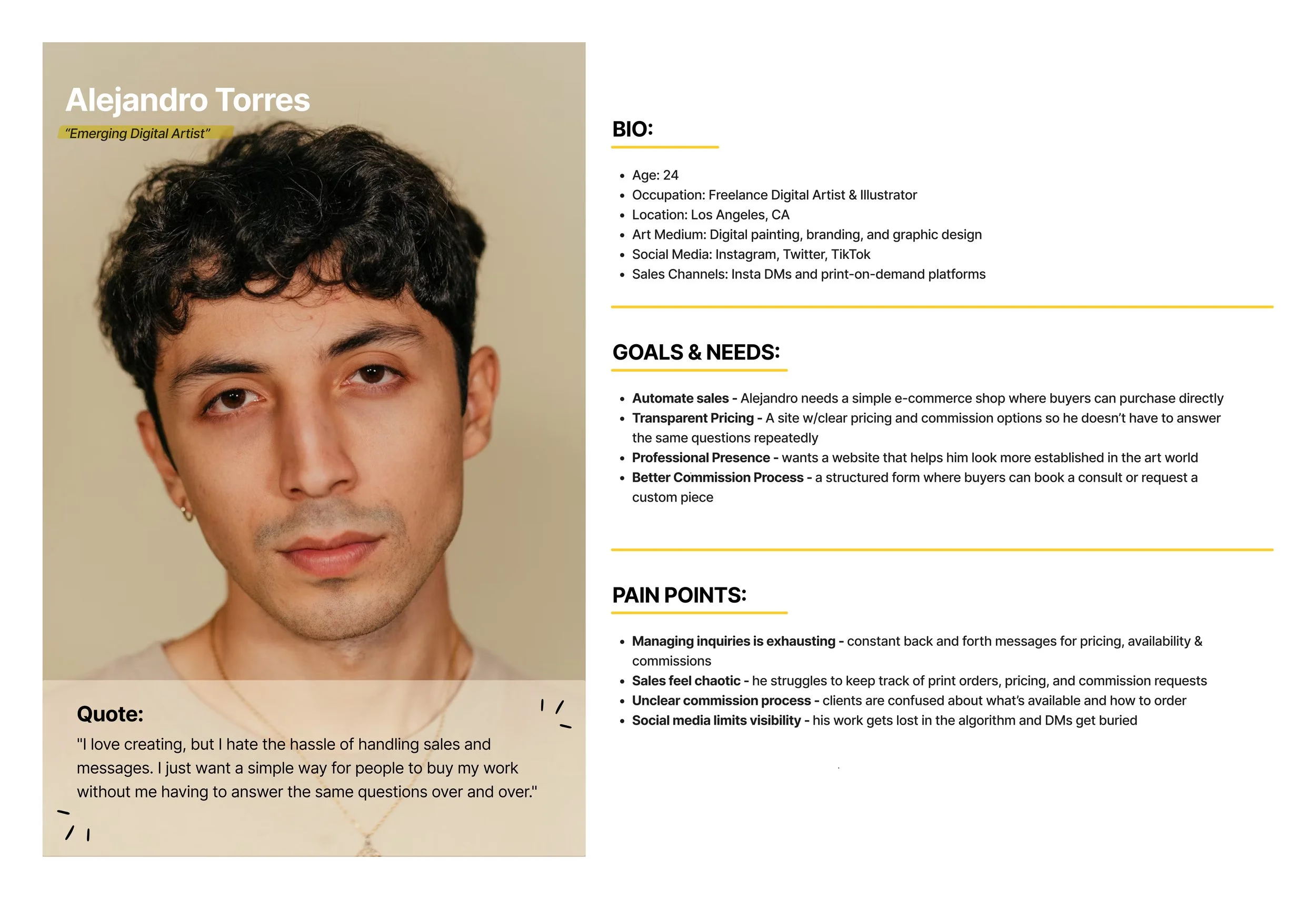 This user represents an emerging digital artist who wants to simplify sales, automate processes, and present a more professional image to buyers. Alejandro struggles with managing inquiries through social media and wants a direct, hassle-free way for buyers to purchase or commission work.